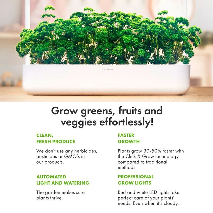 Grow your favorite foods and flowers effortlessly 365 days a year with the fully automated Smart Garden 3. This self-sustaining indoor garden makes sure your plants get the perfect amount of water, light, oxygen, and nutrients; and optimum conditions create optimal plants with the freshest taste and fullest range of nutrients.