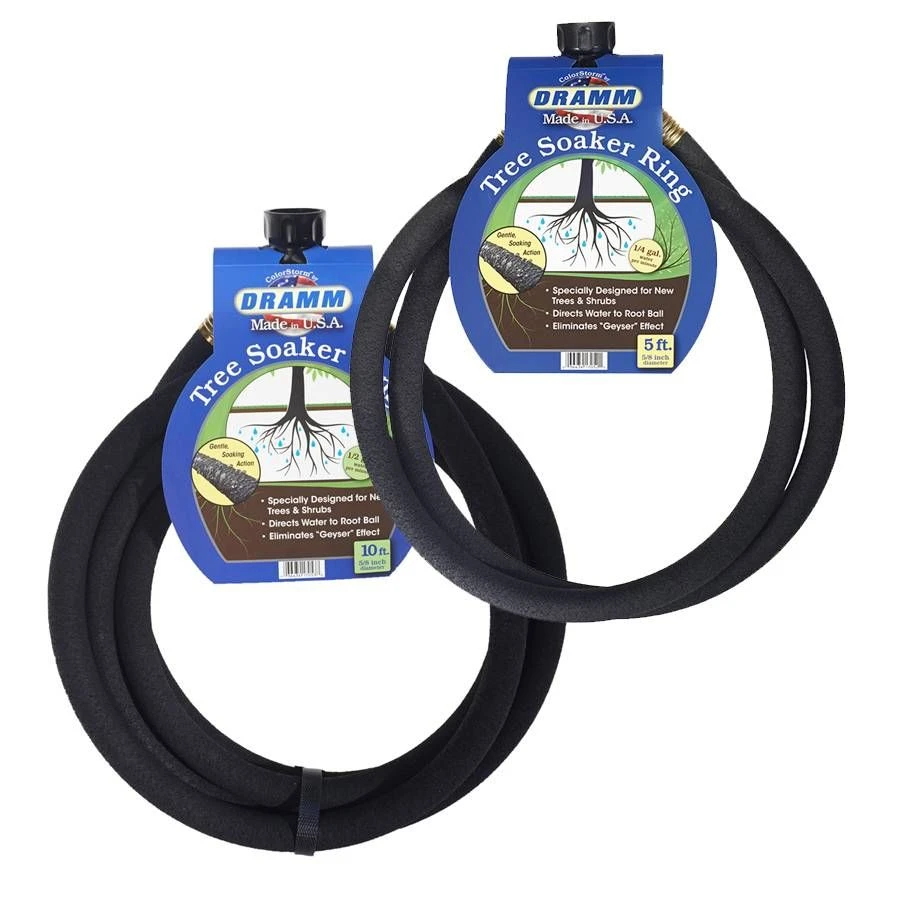 The Dramm Soaker Ring is perfect for watering young plants such as trees and shrubs. It is the choice of professional growers and horticulturists as well as home gardeners across the country. This specially designed ring directs water to the root with its gentle soaking action eliminating the “geyser” effect. More importantly, it uses 90% less water than conventional hoses – meaning your both utility bill and the environment will thank you. This ring is made of recycled rubber and chrome-plated steel and made in America. Save time, money, and the environment by adding the Dramm Soaker Ring to your irrigation collection today. Available in two sizes.