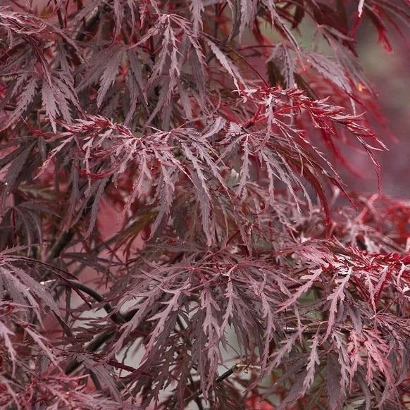 The Red Dragon Japanese Maple is a stunning dwarf maple with lacy, red foliage. Throughout the year, the delicate leaves change from shades of purple and red, culminating in a superb cherry red in autumn. An upright form with weeping branches, the habit of the Red Dragon Japanese Maple is uniquely beautiful.